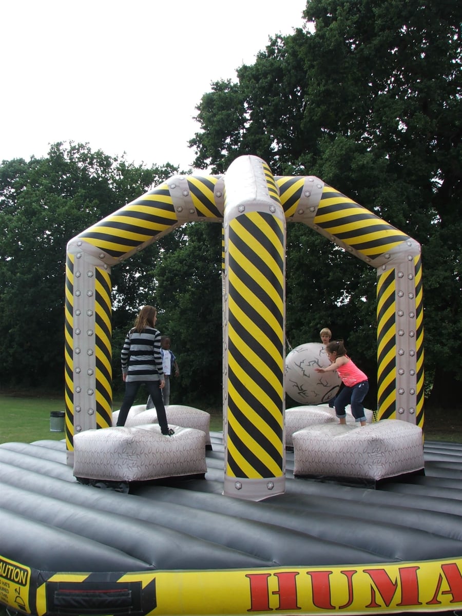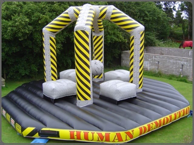 Four imitation aluminium checker plate pedestals, An imitation concrete wrecking ball swinging on an imitation chain. The ball is directed by the four Human Demolishers in an attempt to be the last remaining human. Vibrant visuals and high impact. It's a money making machine that crowds of people can not resist!