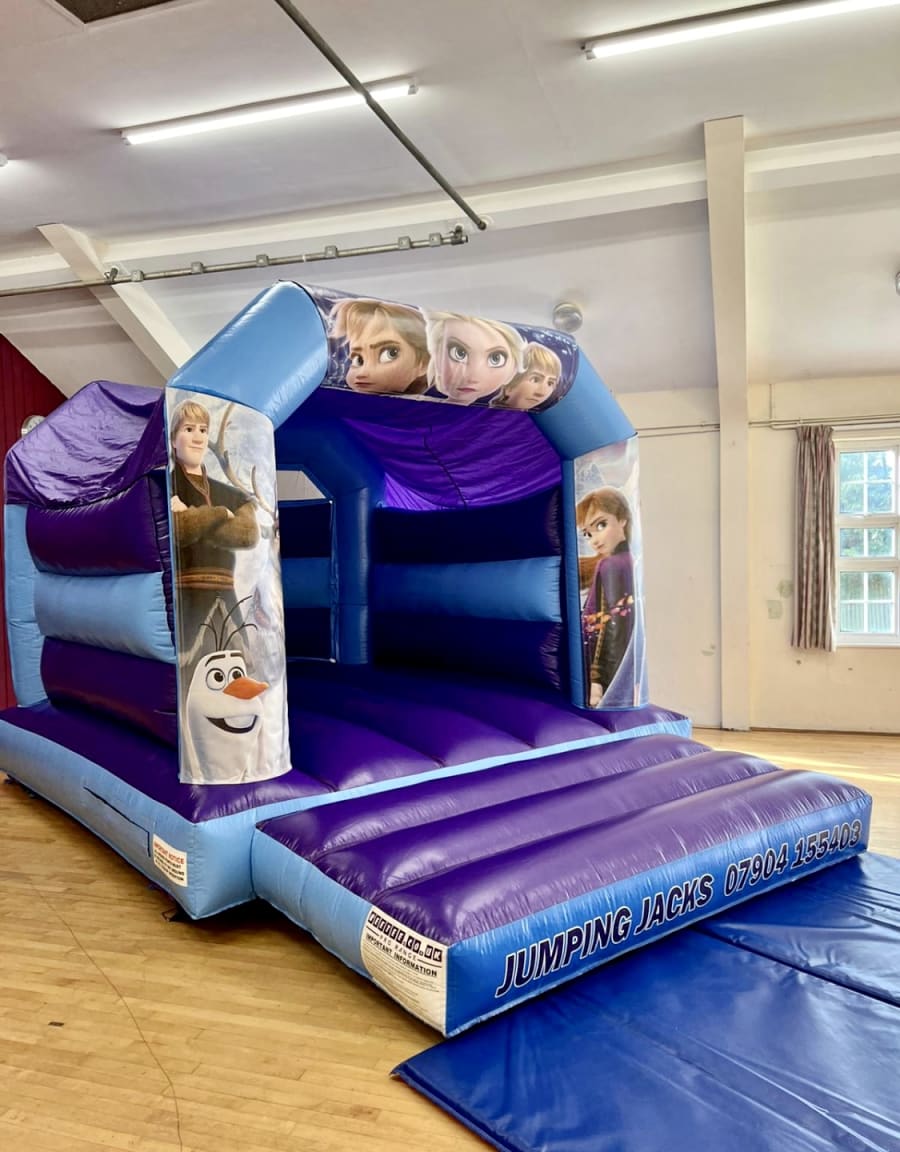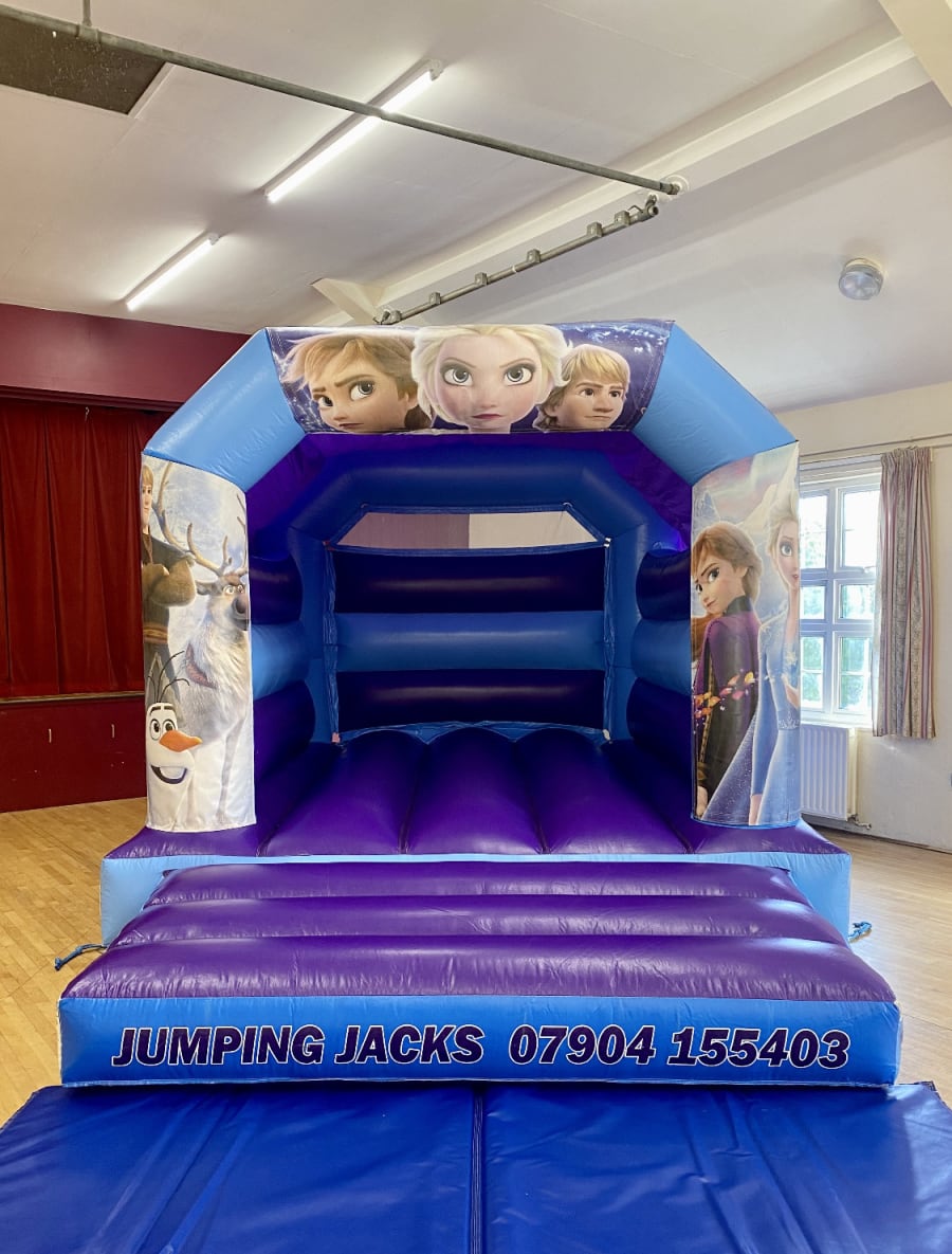 Hire this 11x15 Velcro Frozen themed bouncy castle and you’ll have the perfect way for your energetic party guests to blow off some steam as they jump, spin and fly about.