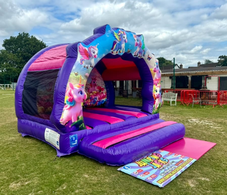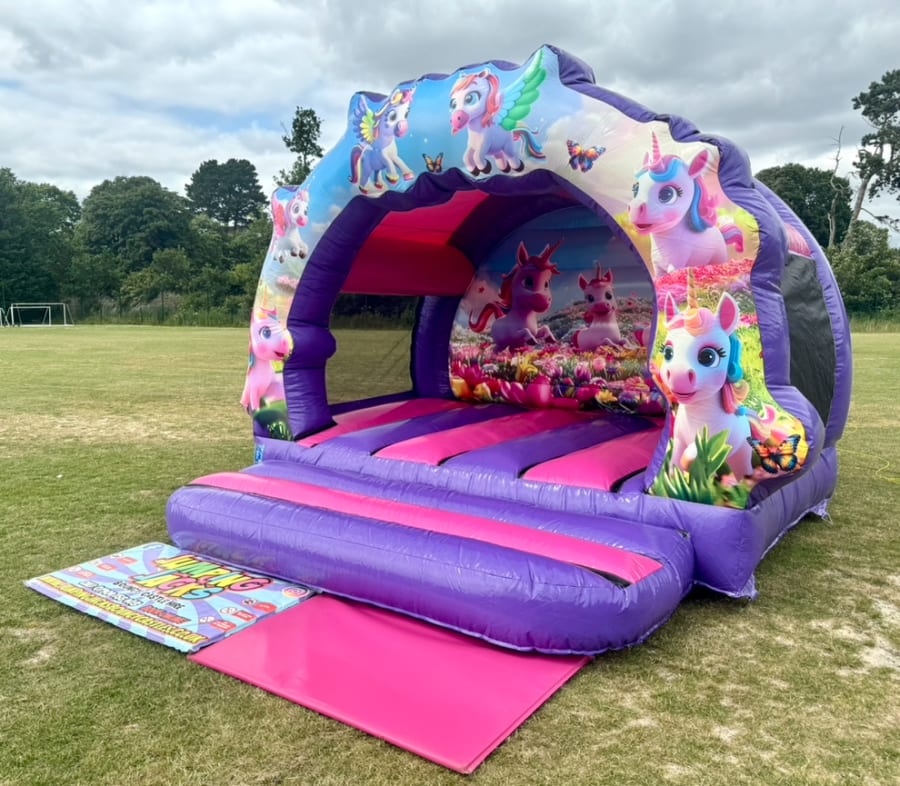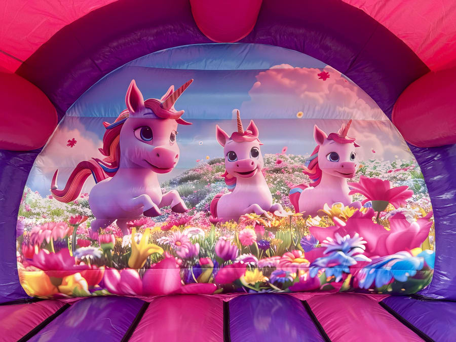 Here is our brand new 12x12 Unicorn curved castle. nice bright colours, perfect to see the kids are safe at all times with the netting on the sides,