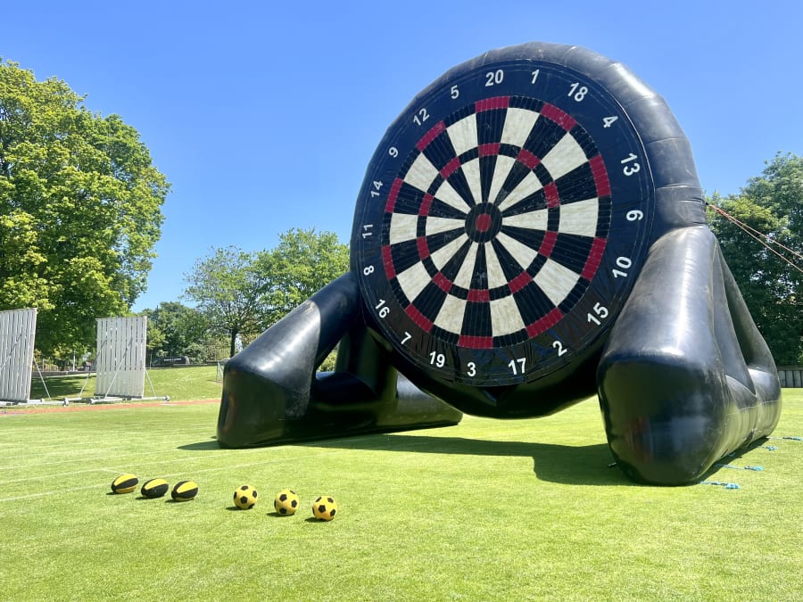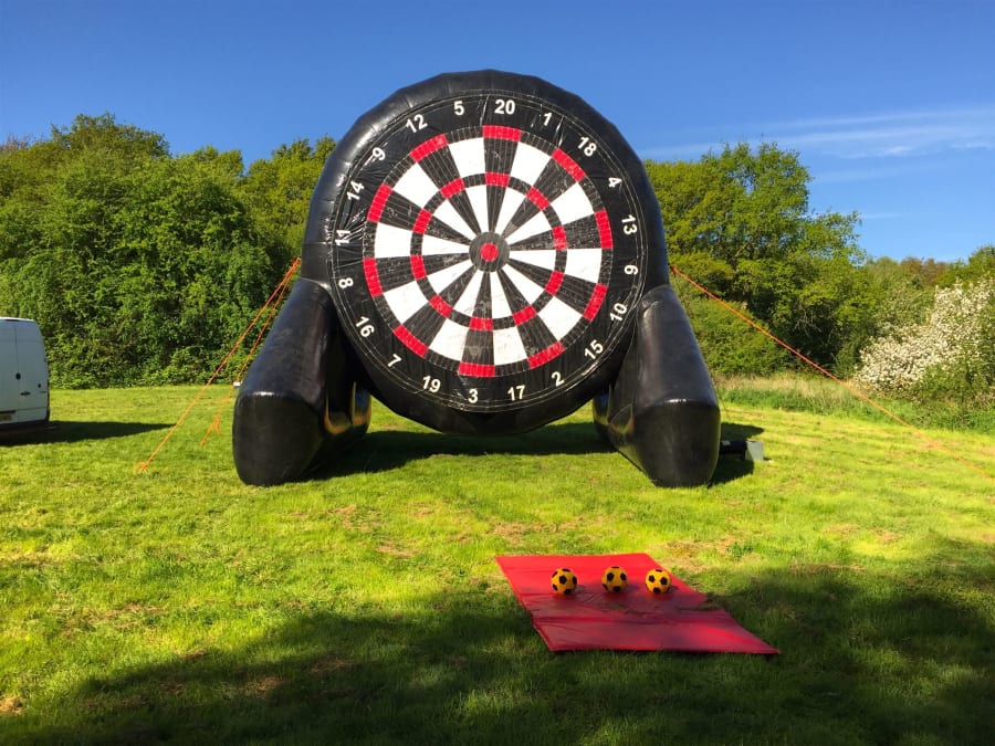 Players take turns to kick the Velcro footballs at the dartboard which will stick to it wherever they land.