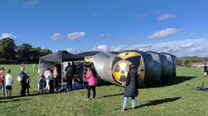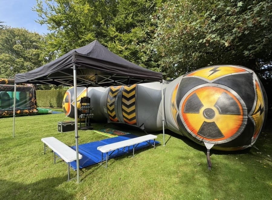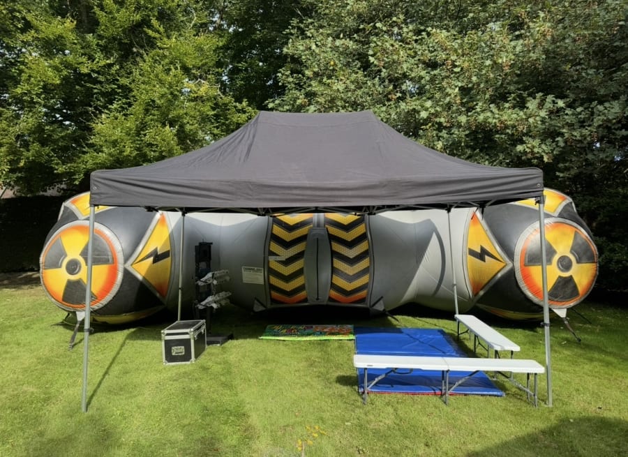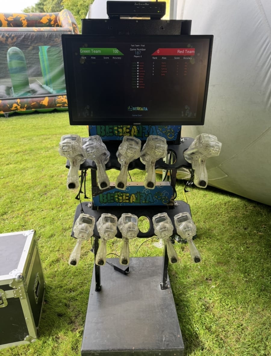 Up to 10 players can battle it out in our full size Laser Tag Arena. Illuminated guns display players individual scores and different coloured lights help to identify your teammates. Whether you work as a team of 5, or shoot it out as an individual player, this inflatable arena transforms any event into a battleground of laser tag excitement.